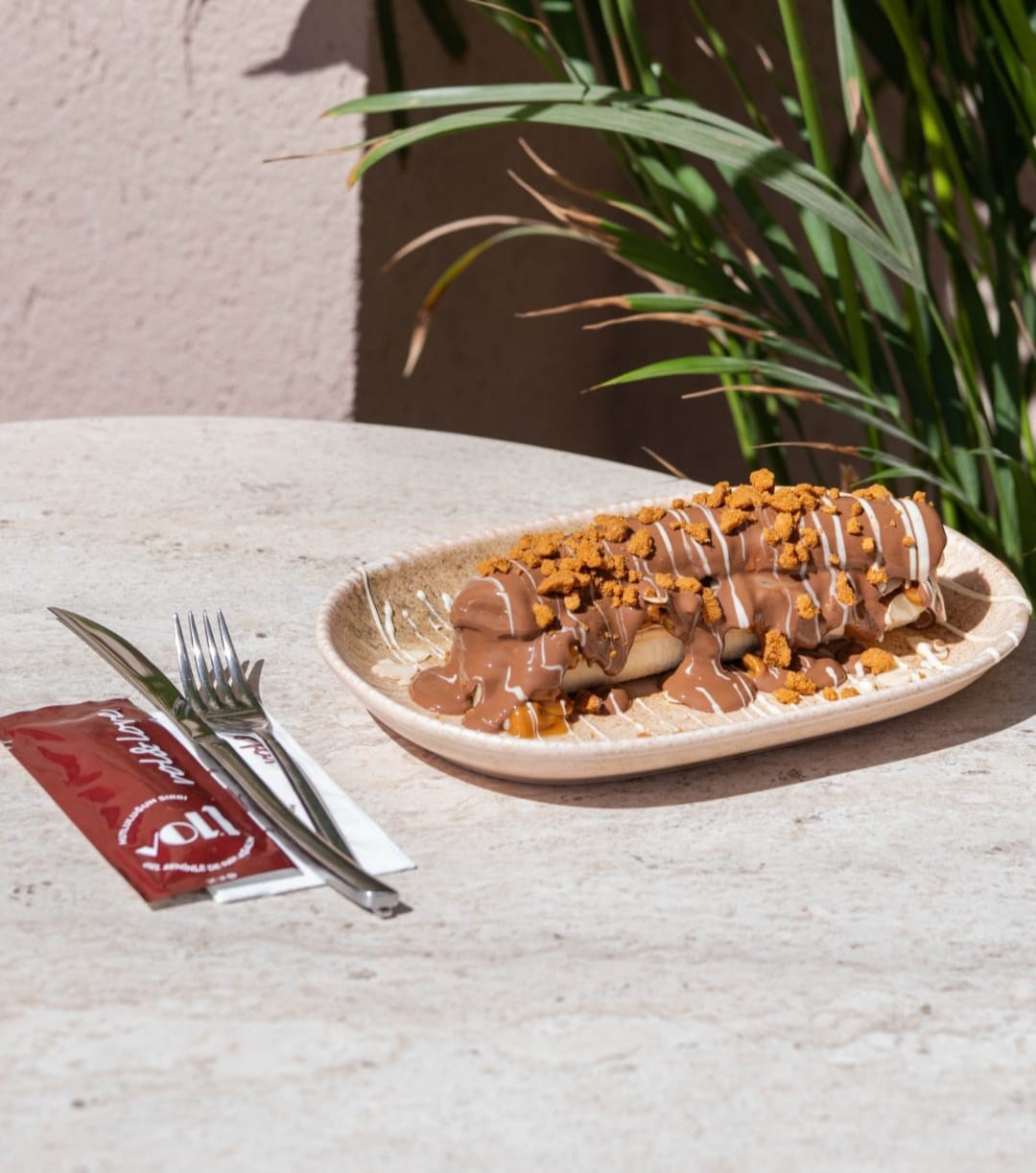 İki muz arasında Vol.1 özel bisküvili krema, bisküvi püresi, tarçın ve file badem, üzerinde ise Vol.1 sütlü çikolata ve Lotus bisküvi parçaları
