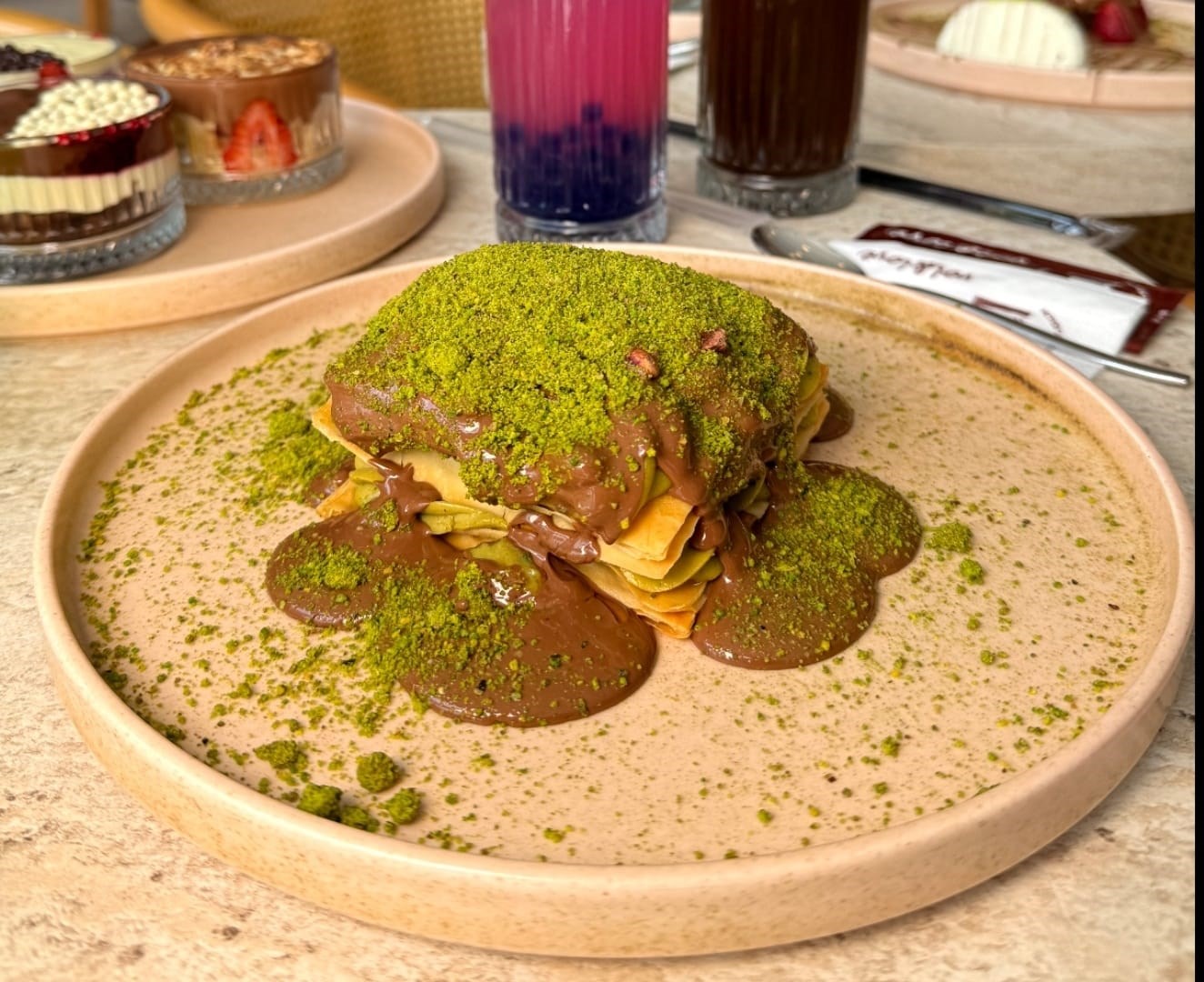 Brüksel waflle, arasında özel Antep fıstıklı krema, çilek, toz Antep fıstığı, bitter ve beyaz bisküvi topları, bol miktarda özel sütlü Belçika çikolatası