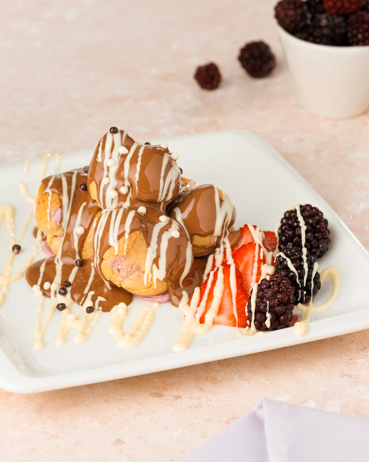 Bir top Belçika çikolatalı profiterol veya çikolata kaplı çilek ile servis edilir.