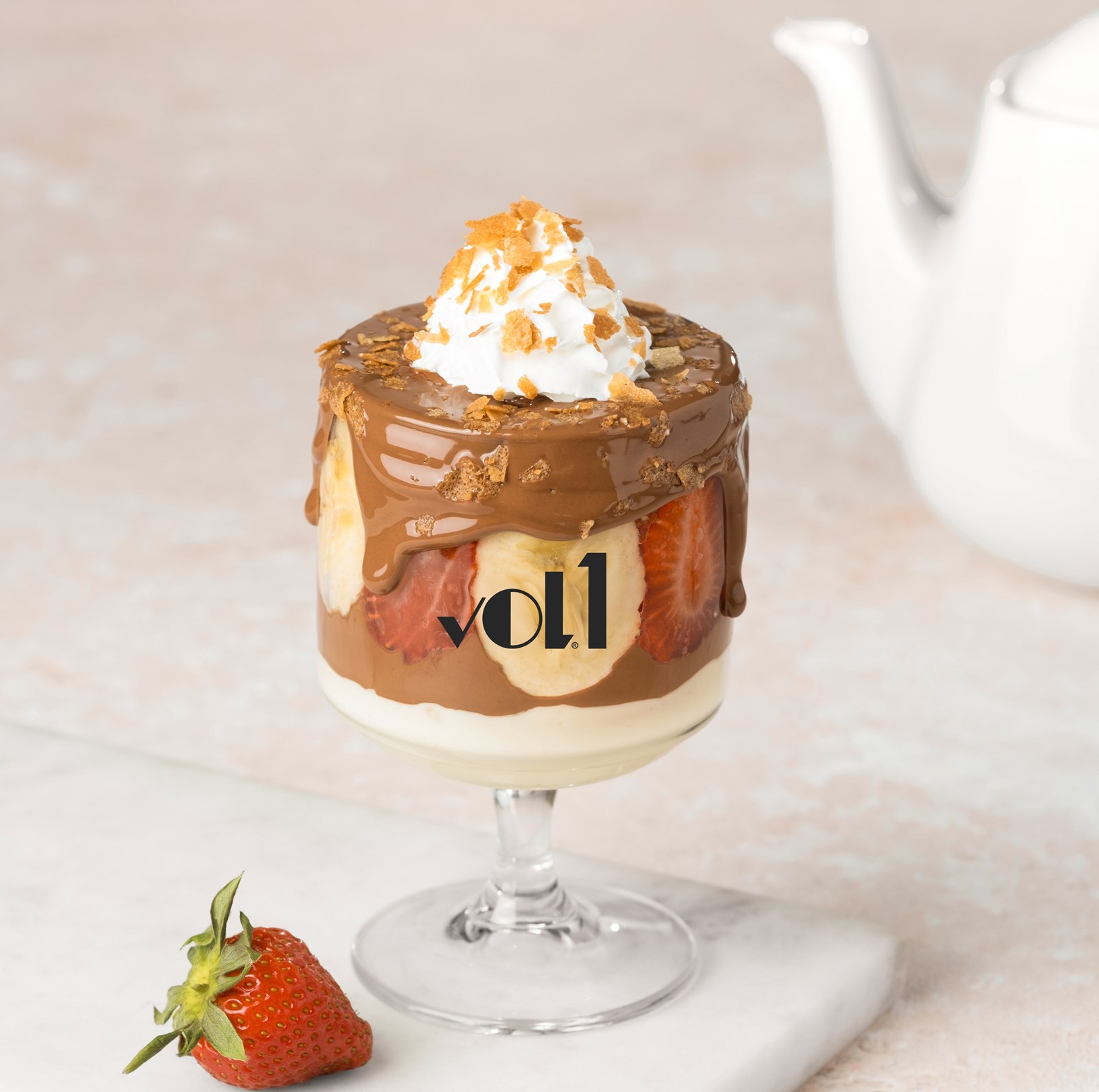 VOL.1 Özel sade krema, çilek ve muz, krep kırığı, sade pandispanya kek parçaları, özel sütlü Belçika çikolatası