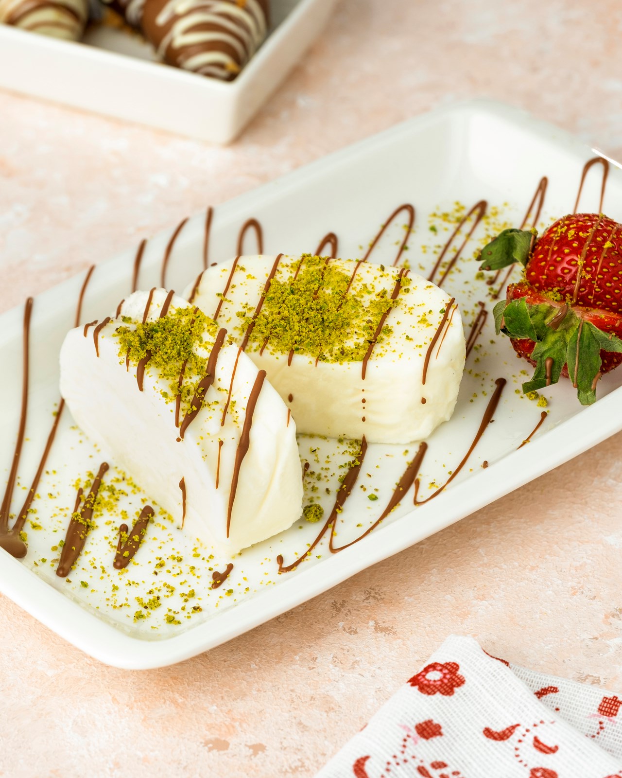 Vol.1 Özel Antep fıstıklı krema dolgusu, bol toz Antep fıstığı, çilek, sütlü Belçika Çikolatası